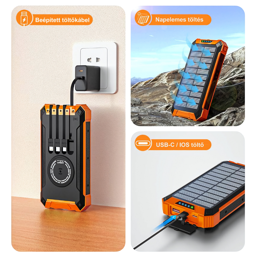 A NOXX napelemes power bank ideális választás azoknak, akik gyakran tartózkodnak a szabadban, legyen szó túrázásról, kempingezésről vagy utazásról, de a hétköznapok bármely más terén is megállja a helyét akár irodai munkáknál vagy az iskolában. Beépített USB, Micro USB, USB-C és Lightning töltőkábeleinek köszönhetően szinte bármilyen eszközt könnyedén tölthetsz vele, sőt vezeték nélküli töltésre is képes.