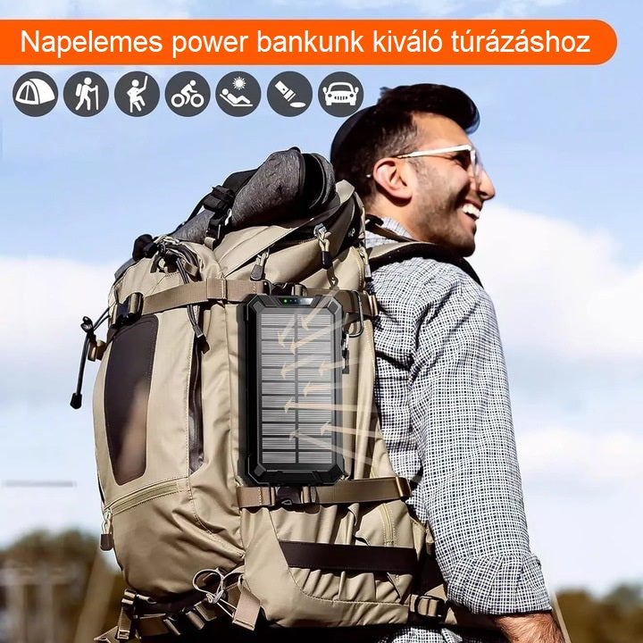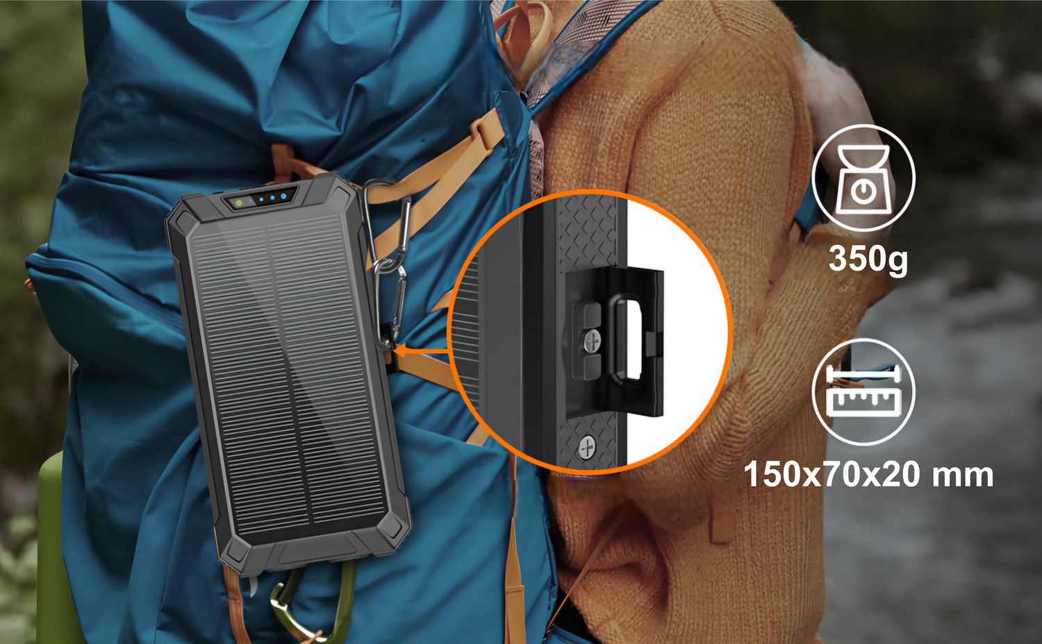 Praktikus beépített akasztóval könnyedén rögzíthető hátizsákra, így túra közben is folyamatosan töltődhet.
