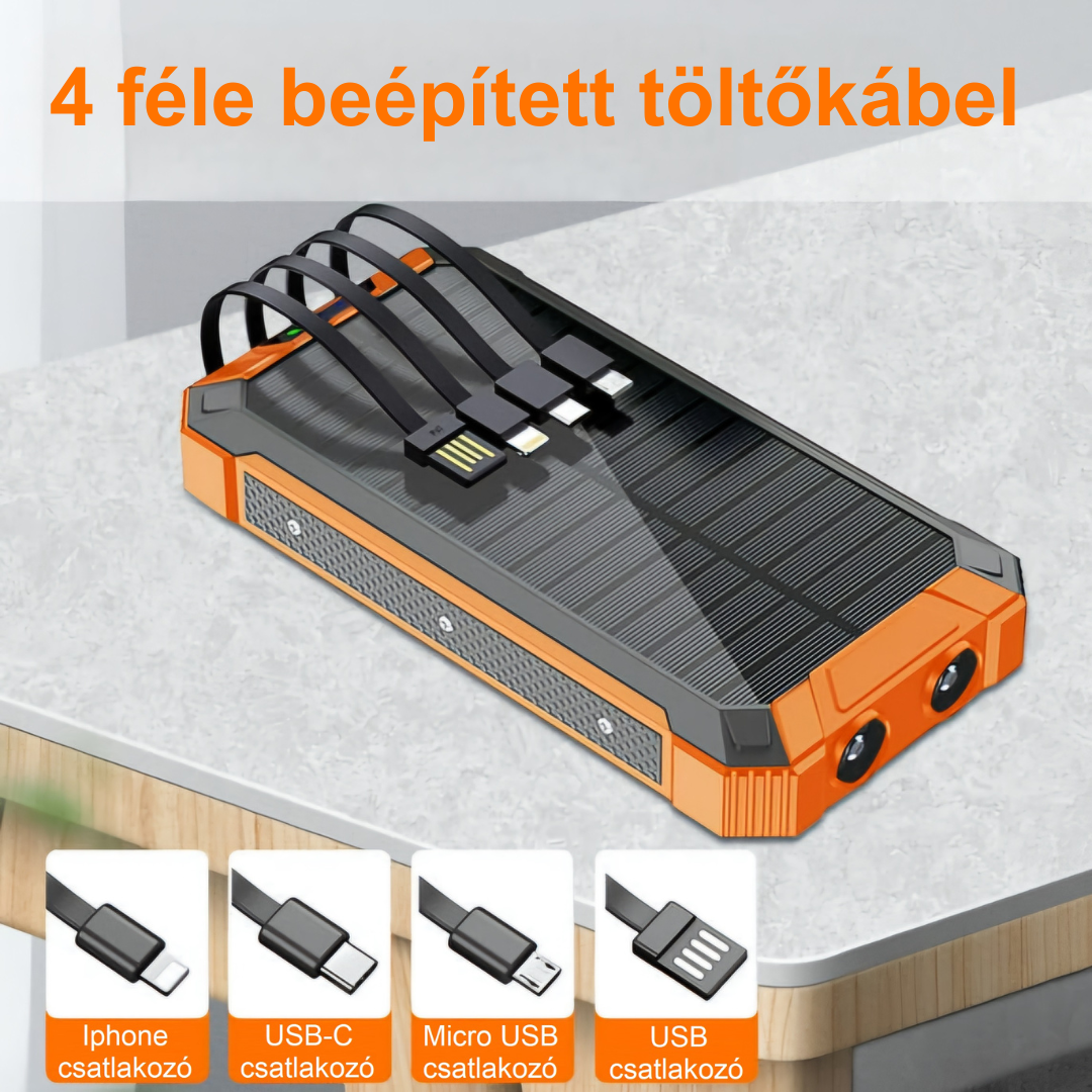 - Beépített töltőkábelek: USB-A, USB-C, Micro USB, Lightning